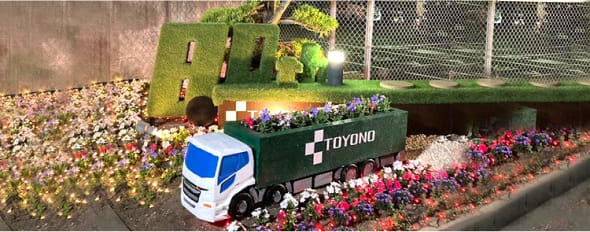 この記念すべき「80th」というキーワードをトラックに見立て、これまでの歴史と想いを原動力に、未来へ進む様子を表現。「TOYONO」の文字をあしらったタイヤには、これからもみなさまの足となり支えとなりたいという想いが込められています。